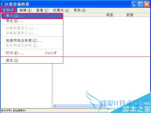 4,把U盘插到乱码电脑上,按上面方法打开注册表,选择“文件”菜单下的“导入”项。