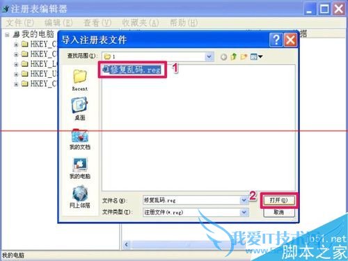 5,打开文件选择框,选择保存在U盘中的“修复乱码.reg”注册文件,按“打开”,注册表就修复完成了。还有个更简单方法,直接到U盘中,双击“修复乱码.reg”注册文件,将其注入到注册表即可。