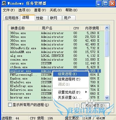 在进程里找到"explorer.exe",右键单击,选择结束进程,弹出对话框,点是。
