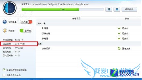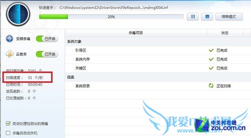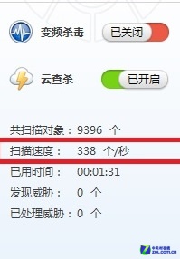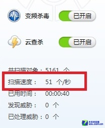 值得注意的是,开启“变频杀毒”前后,杀毒界面的“杀毒速度”发生了较大改变。由之前的“338个/秒”,变为了“51个/秒”。