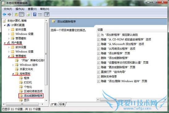 3、进入本地组策略编辑器,依次展开左侧“用户配置——管理模板——控制面板——添加或删除程序”文件夹,如下图所示: