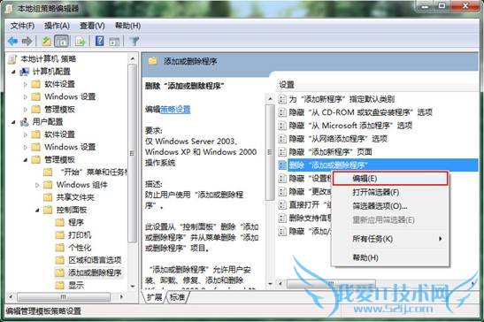 4、鼠标右键点击“删除 添加或删除程序”项,选取“编辑”选项,如下图所示: