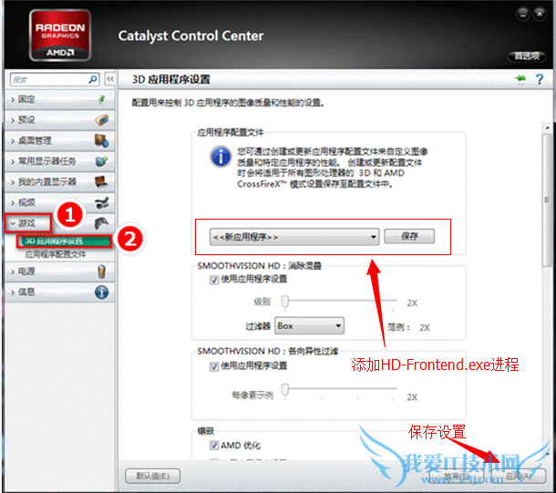 3、(可选步骤) 打开catalyst(tm) control center >游戏 >3D应用程序设置 >新应用程序添加猩猩助手进程 > 保存