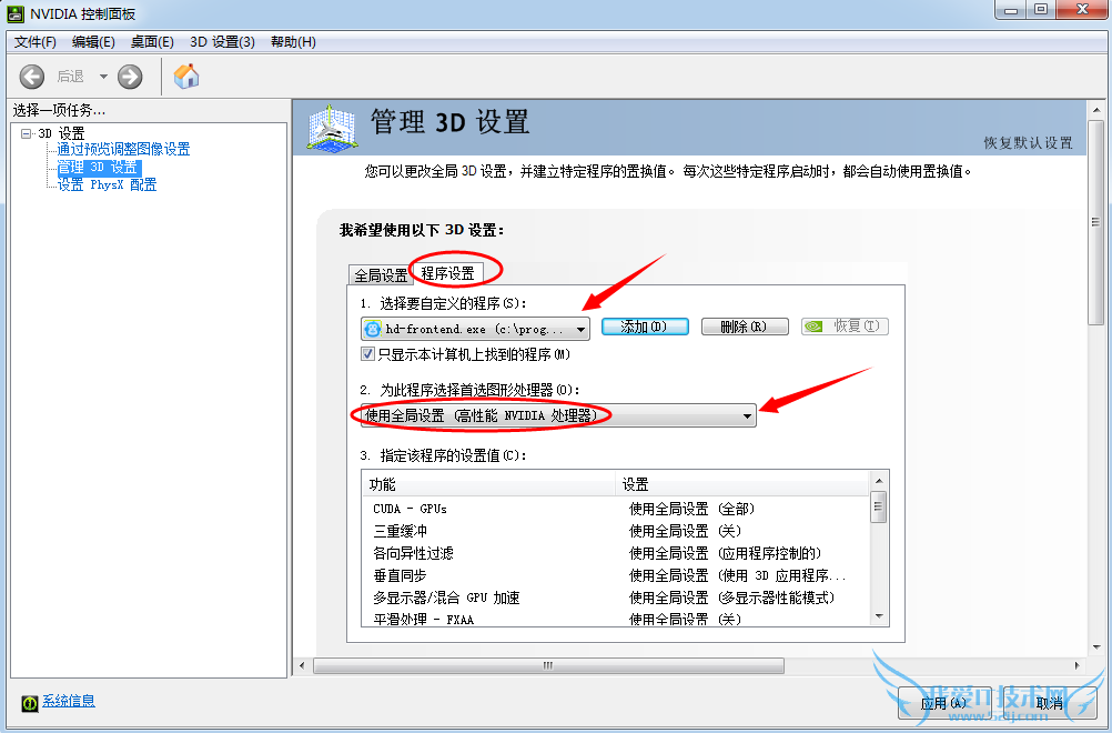 3、(可选步骤)管理3D设置 > 程序设置 > 添加刚启动谷的猩猩助手进程 HD-Frontend.exe
