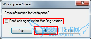 当你拿到一个dmp文件后,可使用【Ctrl+D 】快捷键来打开一个dmp文件,或者点击WinDbg界面上的【File=>Open Crash Dump...】按钮,来打开一个dmp文件。第一次打开dmp文件时,可能会收到如下提示,出现这个提示时,勾选“Don't ask again in this WinDbg session”,然后点否即可。