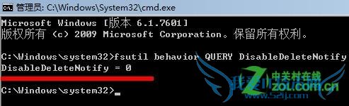 二、开启Trim功能减少磁盘擦写操作,延长固态硬盘的FLASH寿命,Windows 7默认状态下Trim指令是开启的,如果想查询目前的Trim指令状态,我们可以在管理员权限下,进入命令提示符界面,输入“fsutil behavior QUERY DisableDeleteNotify”,之后会得到相关查询状态的反馈。在这里,提示为“DisableDeleteNotify=0”即Trim指令已启用;提示为“DisableDeleteNotify=1”即为Trim指令未启用。