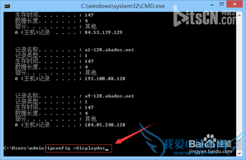 4、在这里,输入“ipconfig /displaydns”命令回车如下图。