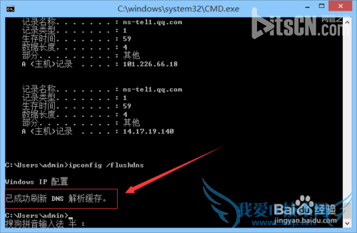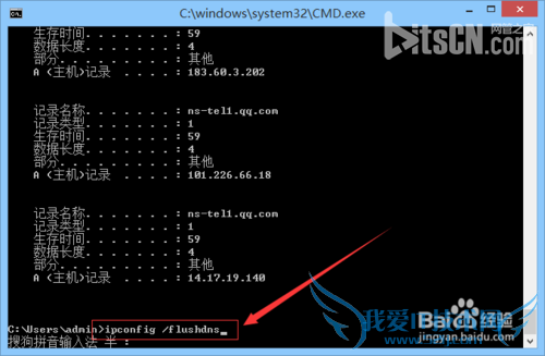 6、然后输入“ipconfig /flushdns ”命令再回车,清理缓存。
