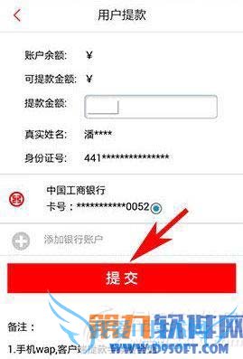 第二步、进入“用户提款”界面后,输入提款金额(提款金额不得低于10块),然后点击【提交】即可。
