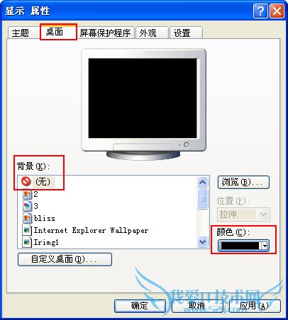 3、在电脑桌面上点击鼠标右键,然后选择属性,接着在界面中我们点击桌面按钮,然后将背景设置为无,颜色设置为黑色。因为桌面背景对电脑的开机速度影响很大,建议去掉。