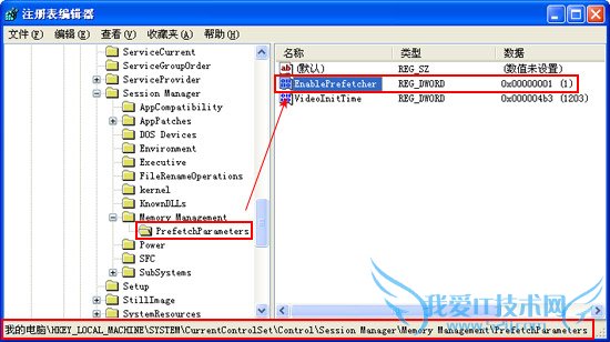 7、点击左下角开始,然后在弹出的界面中选择运行命令,然后输入regedit并回车,打开注册表命令,然后在里面按照路径找到HKEY_LOCAL_MACHINESYSTEMCurrentControlSetControlSessionManagerMemoryManagementPrefetchParameters,然后在右边界面中找到EnablePrefetcher,点击鼠标右键进行修改,设置数值为1,这样可以减少开机时候滚动条的时间。