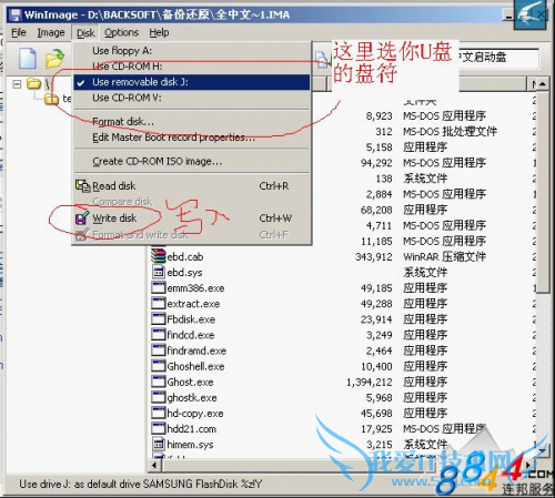 二。关键的一步:在Disk菜单下选择你的U盘所在的盘符,如图:(这里根据大家不同的位置选择会不一样,U盘的盘符在“我的电脑“里看一下就OK了,如果不知道的话: