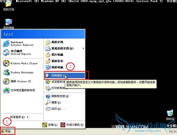 4. 进入系统安全模式的桌面后,依次左键点击“开始”--->“控制面板”--->“添加或删除程序”;