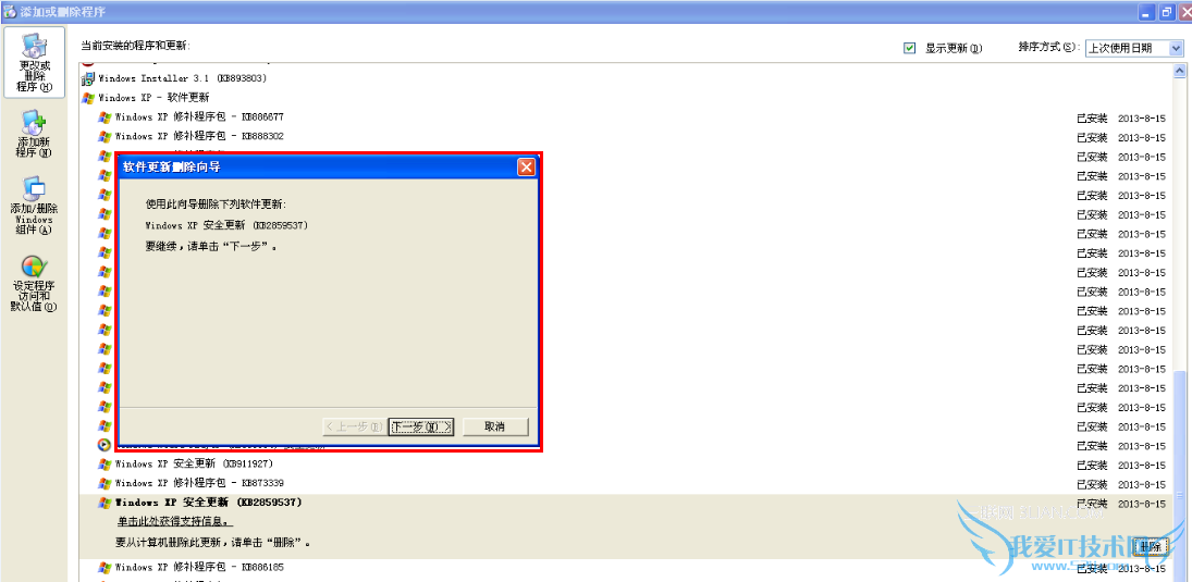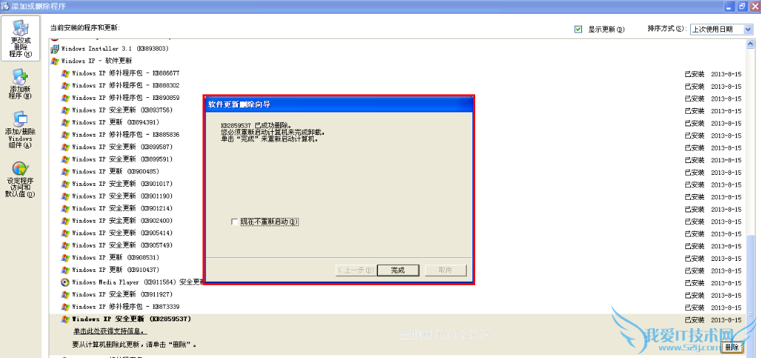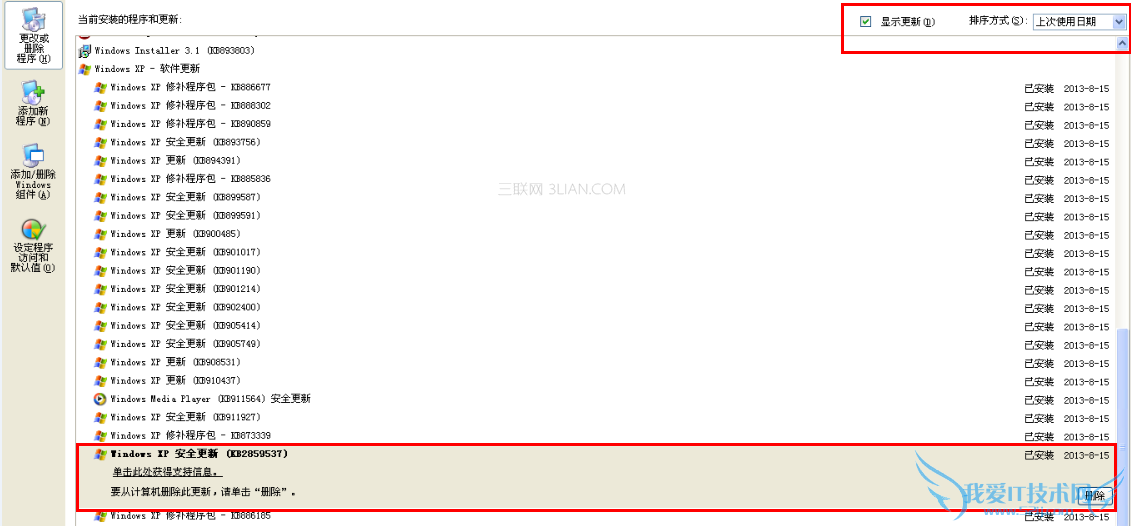 5. 在添加或删除程序页面,勾选“显示更新”--->找到“KB2859537”,选择“删除”;