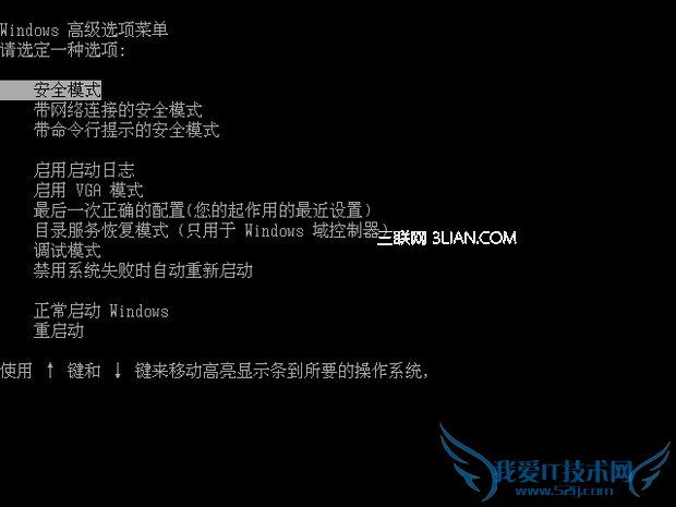 1. 在出现上述界面时,按住电源开关10秒强制关机,确认关机后,再次点击开关键开机,并连续点击键盘上的F8键,直到出现高级选项菜单(如下图)。用键盘右下角的方向键“↓”键选择“安全模式”按“回车”,再选择当前系统,按“回车”;