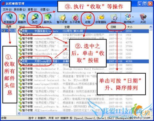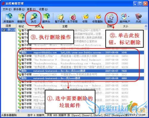 同收取邮件时一样,使用Ctrl键配合,选中所有需要删除的垃圾邮件,单击工具栏上的“删除”按钮,最后单击“执行”按钮(图3),所有选中的邮件在服务器端便被删除了。