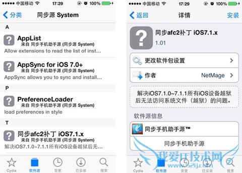 3、添加完成,在“同步收集助手源”中能够看到“同步afc2补丁 iOS7.1.X”,选择并安装。