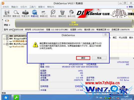 9、接着单击该界面菜单栏上方的“快速分区”,在弹出的窗口中,我们可以设置分区数目和分区大小,将这些设置完之后,点击“确定”按钮;