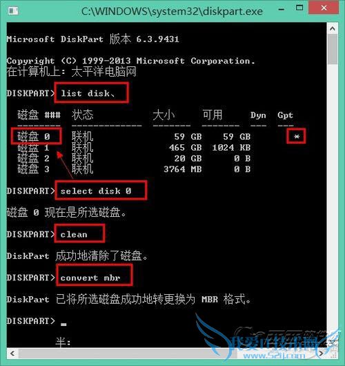 在Diskpart里输入"List Disk",然后输入“Select disk 0”(注:不一定是0,可能是1或者2,判断根据是看0是不是GPT磁盘)。