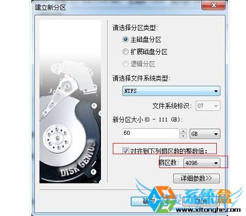 2、分区,分区的时候可以跟普通硬盘一样分区,不过一些要记得勾选"对齐到下列扇区数的整倍数",然后选择4096,4K对齐能让读取写入的速度更 快。