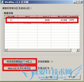 8、单击第一个盘“c”然后选择“将系统安装到这个分区上”和“将此分区作为引导分区”并单击“下一步”。然后继续单击下一步。