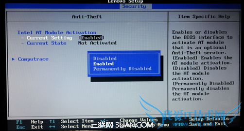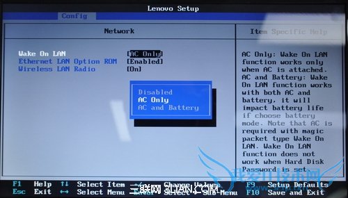 三个选项功能分别是“网络唤醒功能”“网络引导功能”“无线网卡功能”。“wake On Lan”中的“AC Only”即只连接电源情况下启用。“Wireless Lan Radio”设置为“ON”即启用无线网卡。