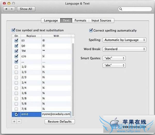 不仅仅是邮箱地址,您可以根据个人需要,添加尽可能多的替换代码。如果某一个代码不再使用,您可以在“替换”列表中将其删除,或者点击“恢复默认设置”(Restore Defaults)来重置所有内容。希望这一方法能为您提供帮助!