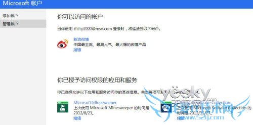 点击“连接新浪微博”,微软帐户页面会给出相关的信息,除了刚才链接的微博,在这里我们还可以看到当前帐户下授权的Win8应用和服务信息。
