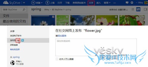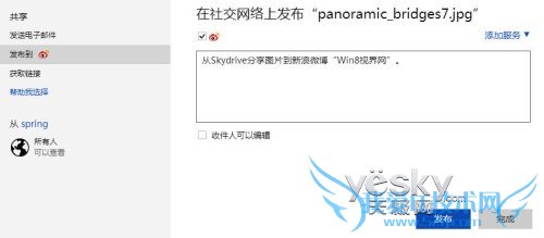 现在我们回到SkyDrive,再次选择需要共享的图片或文件,选择“发送到新浪微博”,输入文字,点击“发布”,在我们连接的微博中就可以看到发布的文字和共享的图片以及链接了。