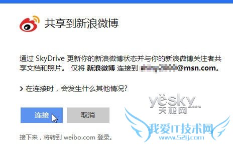 点击微博图标,便会进入“共享到新浪微博”的提示,告诉用户该功能可以“通过SkyDrive更新您的新浪微博状态并与你的新浪微博关注着共享文档和照片”。点击“连接”。