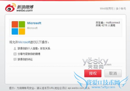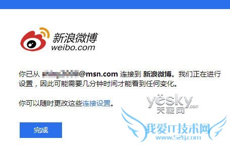 确认授权之后,SkyDrive会提示已经将微软庄户连接到新浪微博。