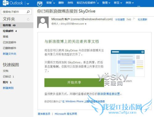 完成微软帐户与新浪微博连接之后,我们的微软账户邮箱将会收到来自微软的提醒邮件,告知当前已经将新浪微博连接到SkyDrive,可以与新浪微博上的关注着共享文档。