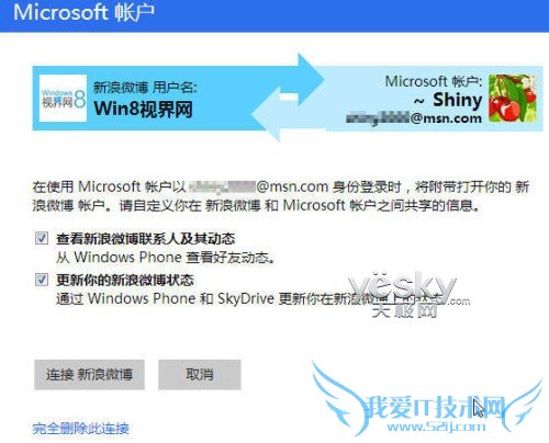 接下来可以设置微软帐户和新浪微博之间共享信息的选项,比如是否从Windows Phone查看好友动态等等。