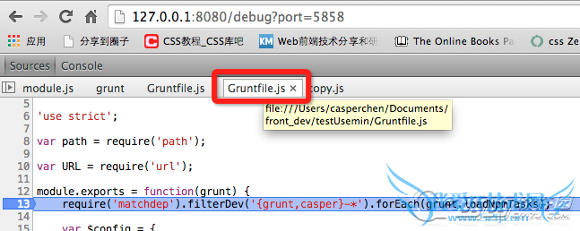 接着,打开chrome浏览器,输入网址http://127.0.0.1:8080/debug?port=5858,就会自动进入断点调试状态。从一旁显示的tips可以看到,全局命令grunt其实就是/usr/local/lib/node_modules/grunt-cli/bin/grunt