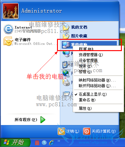第1步:单击打开Windows开始菜单,在打开的开始菜单中找到并单击打开“我的电脑”(计算机)。