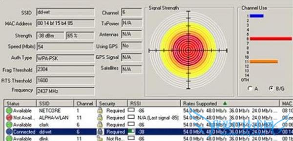 在下方大面积区域我们能够看到当前环境周边扫描到的无线网络基本信息,包括状态是否可用,SSID信息,使用的发射频段,是否加密传输,RSSI信号强度,目的无线网络基本传输速度模式,无线路由器或AP的MAC地址,无线网络组成模式(点对点还是点对多点),连接的时间基本信息等,通过这个区域的信息我们可以清晰详细的了解四周无线网络的组成状况。