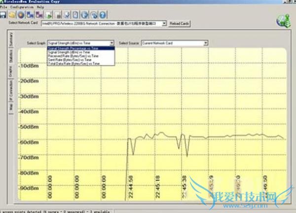 除了上面提到的无线信号扫描功能外,wirelessmon还提供了信号强度检测、监测无线网络的传输速度与图标生成等功能,点主界面左侧的graphs,横坐标是时间坐标,而纵坐标可以由我们来选择参数,包括signal strength percentage,signal strength(DBM),received rate,sent rate,total data rate等等,以便让我们了解网络的下载速度或其稳定性。