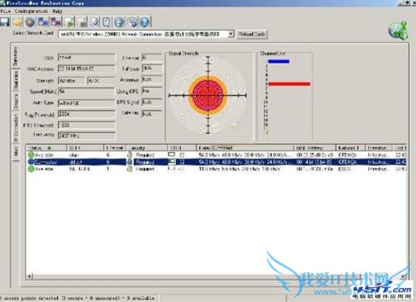 在中间右边区域看到当前环境下周边的无线网络信号基本情况,这里主要显示的是无线信道相关信息,包括有几个2信道,有几个6信道等等,下面还有个切换按钮可以在802.11a与802.11b/g模式之间更换,估计绝大多数人用的无线网络都是b/g的,不过不知道为什么没有未来的趋势802.11n切换。