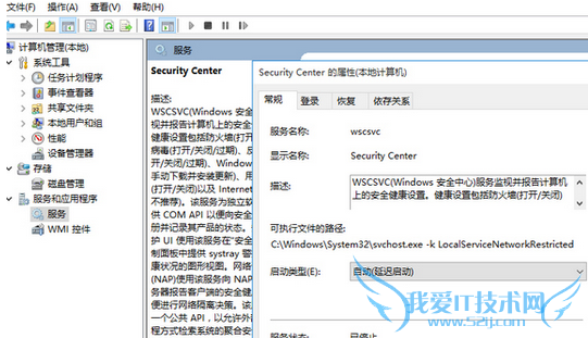 2、然后右击ecurity Center属性 先点击-启动-后启动类型选-自动(延迟启动) 然后应用确定;
