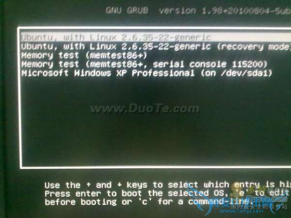 其它的就与硬盘安装一样一步步下去就可以了,安装完后可以在 BIOS 中设置通过 USB 设备来启动。这样机器就会调用 U 盘上的 GRUB boot loader 了,由于我的硬盘上安装的是 Win XP ,你可以从下图中看到,之前在安装 Ubuntu 的时候也把 Win XP 的启动项自动识别出并加入到了 GRUB boot loader 中。