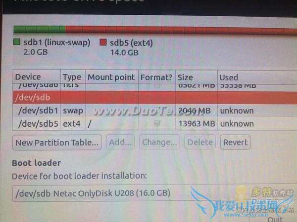 安装注意项:在安装的时候像正常在硬盘上安装 Ubntu 一样,从光盘或 USB Live 盘引导安装程序,当然 U 盘也要插在机器上。关键在于分区的时候要使用手动分区,然后在 Boot Loader 上选择安装到 U 盘,具体见下面的图。