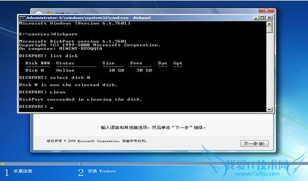 5)输入“clean”命令并按下“回车”键来请除您硬盘中的所有分区及数据;