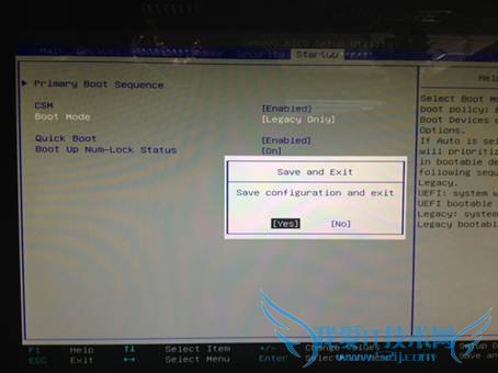 7. 最后,按键盘上的F1,出现保存对话框,选择“Yes”,按回车键(Enter)确认,保存退出,电脑将重新启动。