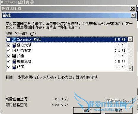 在 Windows组件安装栏里好像有一个跟系统默认游戏有关联的组件:附件和工具.眼前一亮... 心想,那zClient.exe不是微软Microsoft游戏的中心程序吗?也许我把游戏组件干脆删了,或许就能解决问题,于是,我在组件安装向导中顺着[附件和工具]--[游戏]一路点击下去,惊喜地发现里面有一栏[Internet游戏],想想这东东或许就是在线玩Microsoft游戏的关键了.
