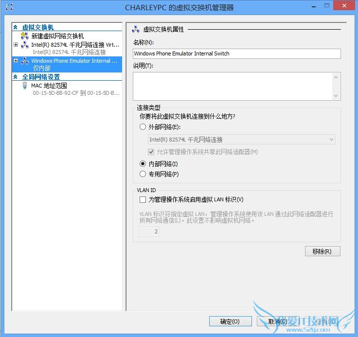 如果没有找到这个虚拟交换机,也不用心急。通过“新建虚拟网络交换机”这个选项,输入“Windows Phone Emulator Internal Switch”,选择“内部”就可以自己建立一个了,效果是一样的。