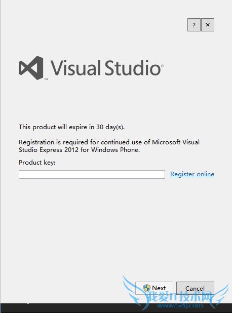 在运行Visual Studio Express 2012 For Windows Phone的时候,会要求输入序列号,这个只需要点击旁边的“在线注册”字样注册就可以收到带有序列号的邮件。
