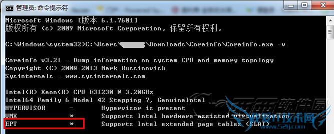 并在命令提示符中输入 “Coreinfo安装路径Coreinfo.exe -v”。intel的处理器,显示为EPT(Extended Page Tables)。AMD处理器,显示为NPT(Nested Page Tables)或RVI(Rapid Virtualization Indexing)。如果CPU支持SLAT,那么你会看见“EPT *”的字样,否则看到的是“EPT -”。