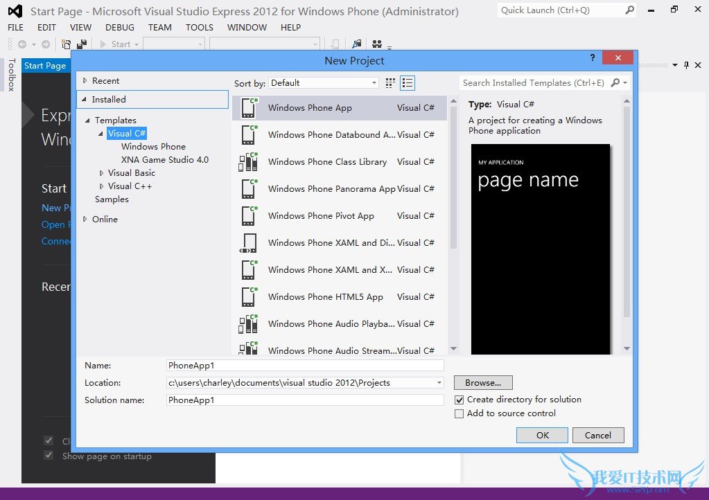 选择Windows Phone App项目模板