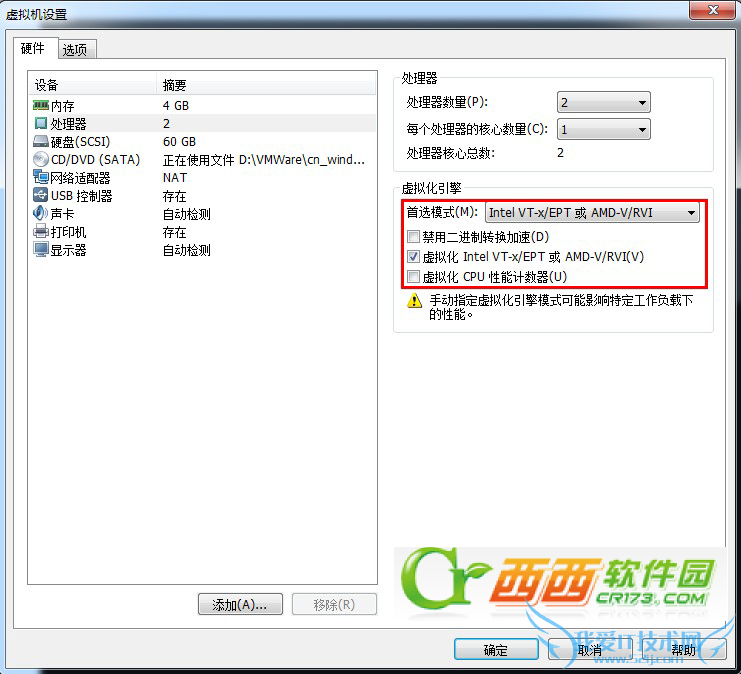 在启动虚拟机前,设置CPU的虚拟化引擎为 “Intel VT-x/EPT 或 AMD-V/RVI”,同时让CD/DVD指向Windows 8 专业版或更高版的iso文件。