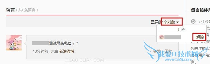 屏蔽后,此用户给您发送的私信会进入到留言箱。
